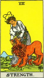 Vidurinioji korta Stiprybė ištraukta kaip patarimas jums. Kortoje vaizduojama mergelė savo švelnumu ir kantrybe sutramdantį laukinį žvėrį – liūtą. Savikontrolė, disciplina,vidinė stiprybė bei optimizmas ir meilė padeda įveikti net didžiausius sunkumus santykiuose. tas liūtas yra jūsų noras atgauti laisvę ir tiesiog reikia su tuo pakovoti. Galite turėti tokius santykius kokius norite. Norite būti laiminga šeima, tuomet sukandusi dantis to siekite. Gal šiuo metu yra tiesiog sunkesnis etapas, kurį ištverti reikia šiek teik daugiau kantrybės, bei antrosios pusės supratimo. Santykių ateitis jūsų rankose ir jūs nuspręsite mėginti juos atgaivinti ar ne. Stiprybės ir kantrybės jums, kad ir ką benuspręstumėte.