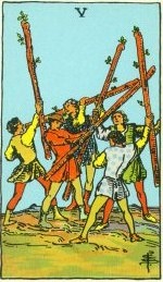 Taro korta - Skeptrų PažasTaro korta - Skeptrų 5Taro korta - Monetų 5